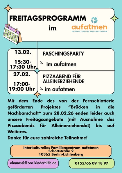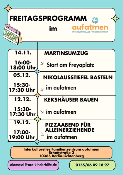 Hier findest du unsere Wochenübersicht. Du findest uns in der Schottstr. 2, 10365 Berlin (externer Link zu Google-Maps).