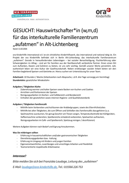 Das "aufatmen" ist ein lebendiger und gleichzeitig entspannender Treffpunkt von Mensch zu Mensch. Es ist ein Ort, an dem Kinder spielen und sich Menschen gleichzeitig zwanglos über alle Kulturen und Religionen hinweg begegnen können. Es ist ein Ort, an dem Menschen in Not Hilfe und Beratung bekommen können. Einfach, schnell und direkt.